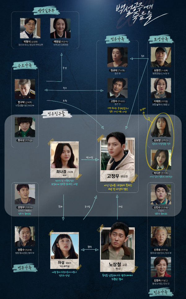 MBC 새 금토드라마 '백설공주에게 죽음을'은 시신이 발견되지 않은 미스터리한 살인 사건의 용의자로 몰려 살인 전과자가 된 한 청년이, 10년 후 그날의 진실을 밝히기 위해 분투하는 역추적 범죄 스릴러 드라마입니다. 시청자들의 이해를 돕기위해, 등장인물, 인물관계도, 드라마 소개를 정리해드립니다. 즐겁게 시청해주세요.