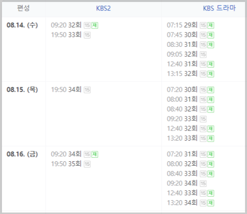 8월 13일 방영된 32회의 가장 빠른 재방송은 8월 14일 오전 9시 05분에 KBS 드라마TV에서 방송됩니다.