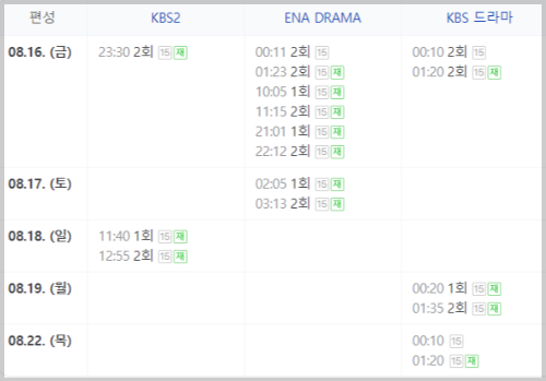 2회 재방송은 8월 15일 00시 10분 KBS 드라마 채널, 00시 11분 ENA DRAMA 채널, 23시 30분에 KBS2 채널에서 보실 수 있습니다.