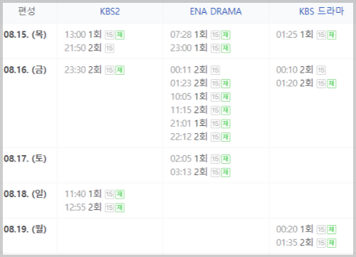 1회 재방송은 8월 15일 01시 25분 KBS 드라마 채널, 07시 28분 ENA DRAMA 채널, 13시에 KBS2 채널에서 보실 수 있습니다.