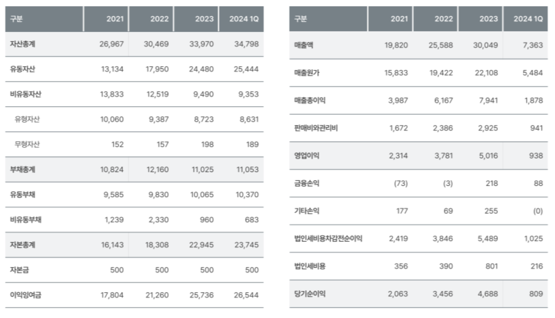 최근 3개년 연속 매출액(198억 →300억), 영업이익(23억→50억)이 증가하고, 매출 증가에 따라 규모의 경제가 실현되며, 이익율(영업이익율 11.67% →16.69%) 또한 상승하고 있습니다. 매출 구성, 매출처, 과거 경영성과를 반영하는 재무제표는 견조합니다.